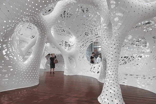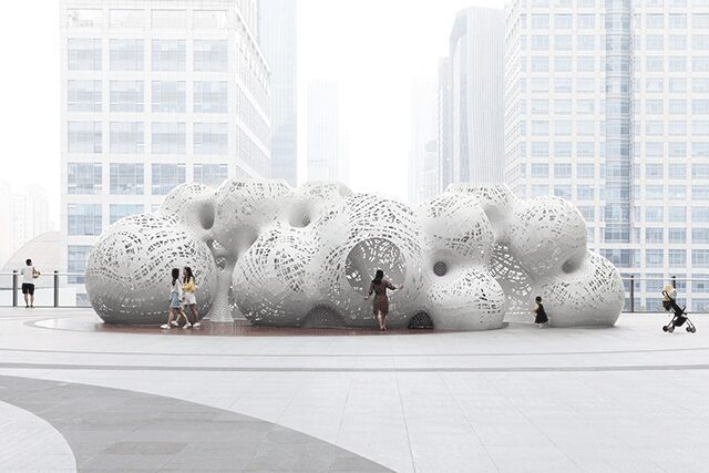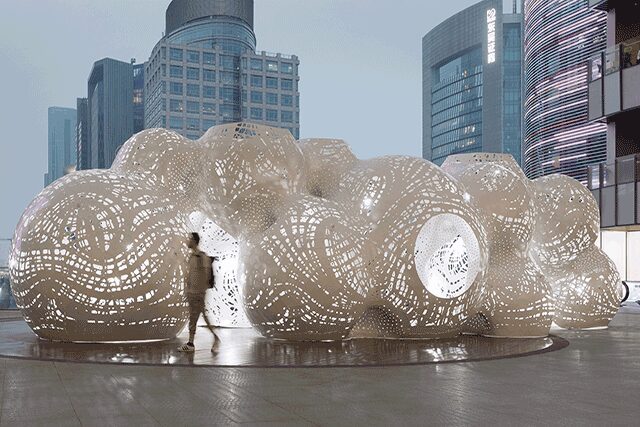 Marc Fornes, architect and founder of multidisciplinary Brooklyn-based firm THEVERYMANY, strikes a rare balance with his large-scale outdoor pavilion at the Suzhou Center in China. Delicate white aluminum forms ultra-thin, massive perforated structures that curve and intertwine while appearing to bubble up from the ground. The porous shell’s undulating surfaces create tunnels and pathways that allow for limitless play. “What impacts people the most is the edgelessness of the environment,” Fornes explains. “All the parts are white, and there are no regular angles to orient you. You have to learn how to experience the space.” The architect’s mission was to create something that would “divert people from their normal paths,” he says. “We think about the structure as a kind of vessel that transports you from the ordinary to some unforeseen world.”