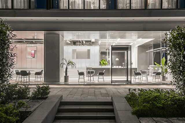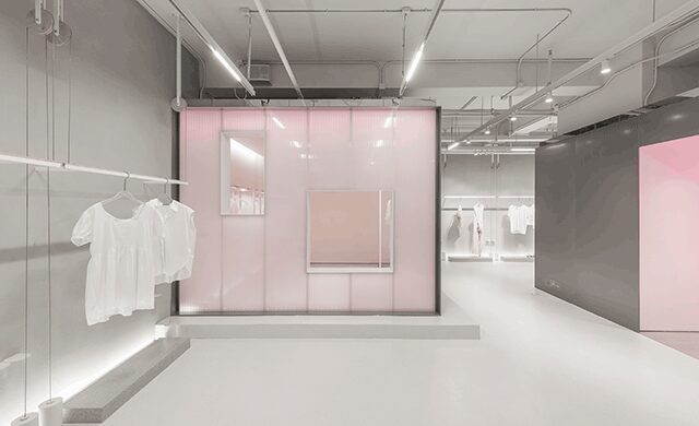 Located in Haining, China, a city renowned for its shadow puppetry and contribution to the art of cinematography as storytelling, Lukstudio founder Christina Luk says she wanted to instill a sense of performance into retail-café hybrid Dear So Cute. The shopping areas serve as a staged spectacle, while the café is where the audience observes the performers. Three boxes clad in steel and polycarbonate panels are placed on an elevated platform to replicate a theater set with windows framing views throughout. “The ‘watch and be watched’ setting blurs the distinction between performers and audience,” Luk says. A clean, bright palette sets the stage for well-lit pink acrylic panels that bathe the store in a pastel afterglow. “Through infusing the experience of an immersive theater,” she says, “[we experimented with] how commercial activities can bring people together and contribute to a better public realm.”