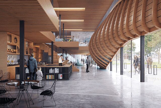 The Climatorium > Lemvig, Denmark, which is at risk for flooding and rising sea levels, will be the new home of international climate center the Climatorium, part of the region’s six-year-long awareness initiative dubbed the Coast to Coast Climate Challenge that already counts 31 private and public partners. Copenhagen firm 3XN’s winning design is centered around a wave motif that takes cues from the area’s fishing boats for the minimalist interiors and marks the entrance in a curvy, inviting light wood. “We have tried to design a building that sparks curiosity and is open and welcoming to visitors and researchers,” says Jan Ammundsen, senior partner and head of design for 3XN. The resilient building’s wraparound glass façade guides the eye to the wood-clad top floor that appears to be floating, while the undulating landscape surrounding the building, known as the Climate Wedge, mirrors isobars (the lines of pressure on weather maps) and will comprise local plants that thrive in the coastal environment. When the $7.9 million site is completed in 2020, the hope is that it will create jobs and spur the economy.