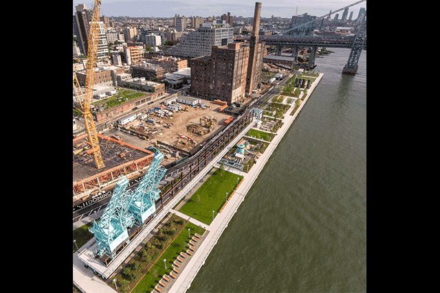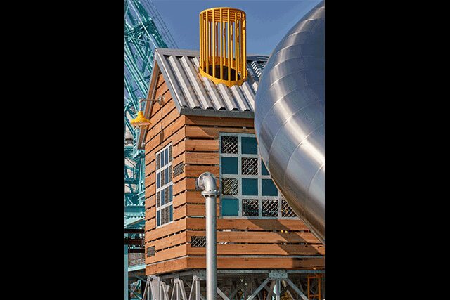 Sweetwater > Part of the new Domino Park that stretches along the waterfront in Williamsburg, Brooklyn, Sweetwater playground pays homage to the historic Domino Sugar Refinery, which shuttered operations in 2004 after producing sugar for nearly 150 years and is now being restored as part of a larger residential community from developer Two Trees. Designed by artist Mark Reigelman, the playground “reflects the chaotic structures of the early industrial buildings previously on the site,” he says. Sunshine yellow, turquoise, and mint green hues echo the factory’s original colors, while the façade of the elevated Sugarcane cabin is made of repurposed wood from the factory’s floors. Scattered throughout the cabin are red valve wheels that were molded and cast from ones salvaged from the factory.