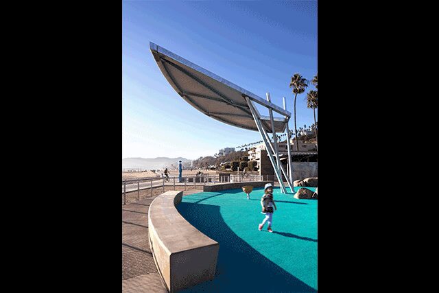 North Beach Park > Located at the base of a bluff between the scenic Pacific Coast Highway and the beach, this one-acre seaside park in Santa Monica, California is inspired by the ocean and references the towering sand dunes that formerly occupied the site. A series of steel-framed shade structures cover the two distinct play zones that both offer barrier-free equipment for extra maneuvering space. Meanwhile, a sensory garden offers children an opportunity to interact with and learn from the landscape.