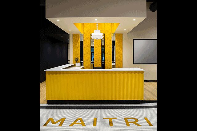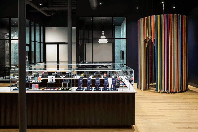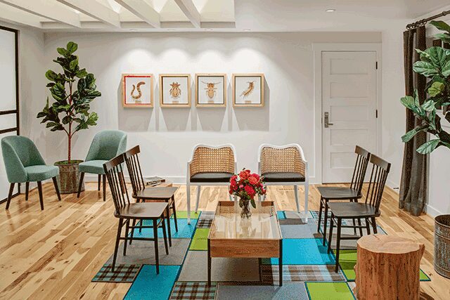 Maitri > Stone also helmed the design of Maitri in Uniontown, Pennsylvania. Custom millwork, vibrant furniture, rugs, and accent walls help to distinguish the various spaces, while Stone “put an artistic spin” on the standard ATM by surrounding it with colorful ribbon—adding both whimsy and privacy. The standout feature, however, is a 14-foot-tall document wall that amplifies the history of the town with photos combined with the text of the Pennsylvania Medical Marijuana Act. Stone adds that it “reinforces a sense of community by bringing the brand, mission, and history of the area to life in an impactful way.”