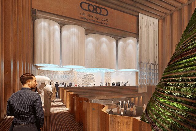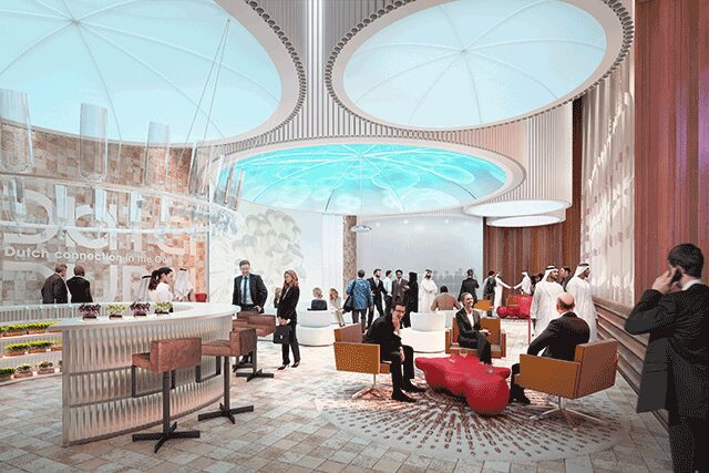 Dutch Pavilion > When it debuts at Dubai Expo 2020, the Dutch Pavilion will serve a larger purpose as a closed-loop climate system that strives to find a way to “make sustainable buildings that offer more than they take,” says Michiel Raaphorst, architect director at V8 Architects. As the nexus of water, energy, and food, the Rotterdam firm, in collaboration with Expomobilia, Amsterdam exhibition architects Kossmann Dejong, and engineering and consultancy firm Witteveen+Bos out of the Netherlands, conceived a biotope crawling with plants that will contribute to the space’s microclimate. Enclosed behind a transparent façade, the tower will not only challenge the global perception of climate change but also offer alternative solutions to our dwindling natural resources. Ultimately, Raaphorst says, “it shows how to do more with less available space.”