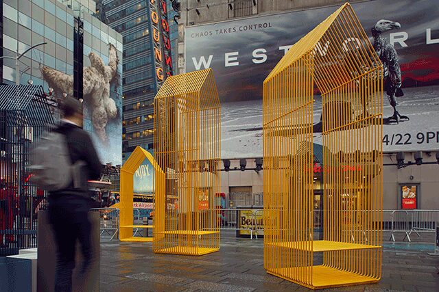 In an always-buzzing section of New York like Times Square, pedestrians spend more time avoiding off-brand Disney characters than enjoying the scenery. That’s where the Times Square Alliance’s Design Lab comes in, tasking local designers Brad Ascalon, Joe Doucet, Louis Lim, DYAD by Doug Fanning, and Hive Public Space with rethinking how people use heavily trafficked public spaces. One solution is Doucet’s five solid steel seating pieces, the Village, which evoke both a soaring skyscraper and a cozy home. Done in a friendly taxi cab yellow or a warm navy blue, they range in height from 10 to 14 feet. “The icon of the house is a universal symbol of belonging, and it was a powerful visual metaphor,” says Doucet, “signifying that people can rest here and congregate.”
