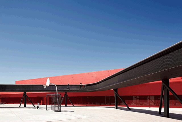 A fire station-playground hybrid in Chile from local architects Smiljan Radić, Eduardo Castillo, and Danilo Lazcano came to fruition after the team won the “I Love My Suburb” competition, which tasked the trio with creating a 162,000-square-foot masterplan for the low-income Boca Sur neighborhood that would include a library, play area, and multi-use hall. Two board-marked concrete structures comprise the perimeter, enclosing an open area that’s home to a playground, sports court, and seating area, while a bright red-painted fire station flanks the outside—a vibrant counterpoint to the white building containing the hall, library, and shops on the opposite side.