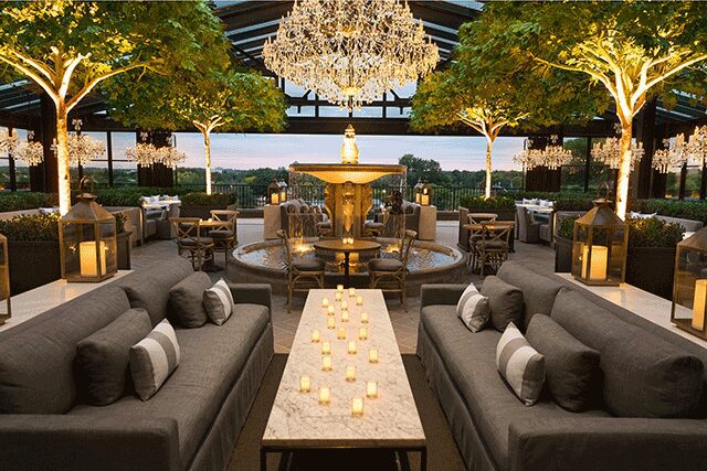 Atop the third floor’s floating staircase is the rooftop restaurant, housed underneath an atrium and complete with a wine and barista bar. This skylit garden backdrop nods to grand European ones of yore, with trellised London plane trees, a gurgling water fountain, and retractable glass walls. Amid the dreamy mix of crystal chandeliers, lanterns, and sculpted evergreens are selections from the RH Outdoor collections, extending the store’s residential-meets-retail narrative.