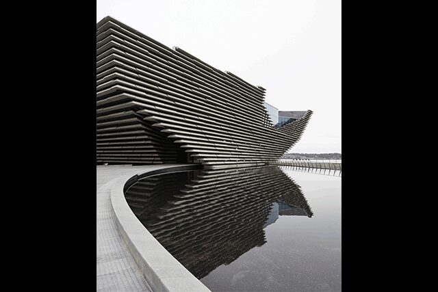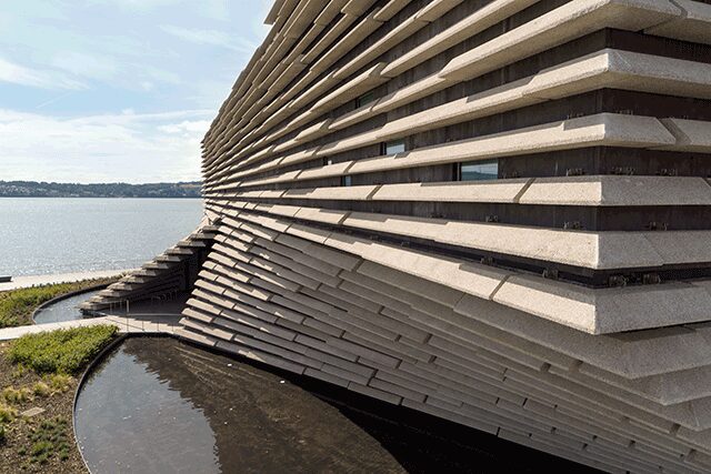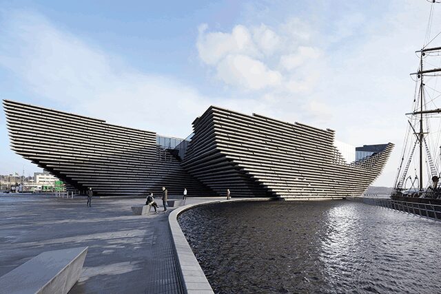 In designing the first V&A museum outside of London, Japanese architect Kengo Kuma hopes its sister location in Dundee, Scotland “will play a symbolic role in architecture for the next generation and emphasize that architecture is not something set against nature, but a being to be integrated with the landform.” Inspired by Scotland’s famed cliffs, Kuma fashioned two inverted pyramids and clad them in horizontally stacked, pre-cast concrete. The tilting masses twist and intertwine to connect at gallery floors, which will house 300 exhibits with collections from the London V&A, as well as museums and private collectors across Scotland and the globe, showcasing everything from ceramics and textiles to healthcare and video game design.