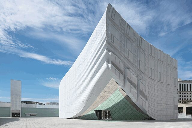 The Imprint near Incheon Airport, Seoul: Housing a nightclub and indoor theme park, the Imprint from Rotterdam firm MVRDV, with interiors of the 60,000-square-foot nightclub spaces by New York-based Josh Held Design, comprises two buildings within the larger Paradise City casino and hotel complex. The challenge: to craft two structures without windows that are connected with their urban context. To that end, the designers creatively dreamed up liquid-like volumes that copy the façades of the surrounding buildings, “creating a relief pattern, like an ‘imprint,’” according to the design team, which was led by Winy Maas and Jacob van Rijs, two of the cofounders of MVRDV. Constructed with nearly 4,000 glass fiber-reinforced concrete panels (individually produced using 3D modeling files), they were painted white to emphasize their clay-like quality as well as the relief. For an impressive statement, half of one of the dramatically lit monolithic structures drips in a dazzling accent layer of gold paint that beckons airplane passengers as they descend into the city, while a section of each building (a corner of one, the middle of the other) lifts like curtains to reveal mirrored technicolor entrances. As the MVRDV team notes, “It turns the buildings into an art piece, [where] the boundary between art and architecture almost vanishes.”