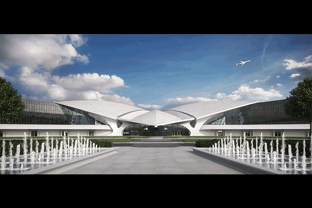 TWA Hotel at JFK Airport, New York: The upcoming TWA Hotel (a collaboration between New York firms Stonehill Taylor, INC Architecture & Design, Lubrano Ciavarra Architects, and Beyer Blinder Belle) will give new life to Eero Saarinen’s iconic 1962 TWA Flight Center, which was designated a New York landmark in 1994 and officially closed in 2001. The new continuously curved façade, designed by architecture firm Lubrano Ciavarra, defers to Saarinen’s soaring concrete structure. “It is simultaneously luxurious and efficient, like a plane,” says cofounder Anne Marie Lubrano. The property’s triple-glazed, seven-layer laminated glass windows allow guests to sleep comfortably just a few hundred feet from the runway. Defined by clean lines, dark wood, brass finishes, and a martini bar, the 505 midcentury-inspired guestrooms from Stonehill Taylor boast views of the Flight Center through floor-to-ceiling windows. “Imagine watching the light change over the concrete shell,” adds Lubrano. “What could be more Jet Age glam than that?”