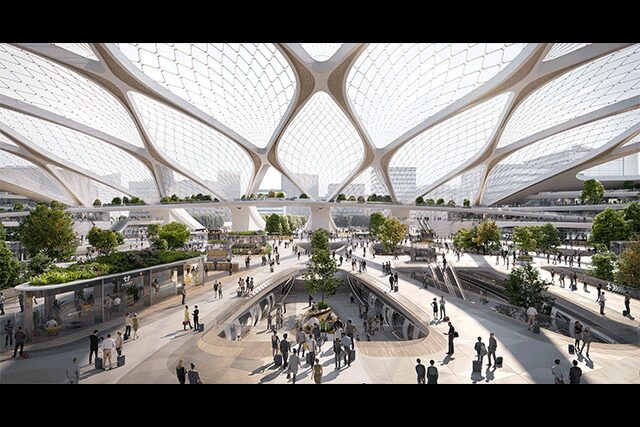 Hardt Hyperloop Stations: Though the proposed Hardt Hyperloop high-speed European train is still a concept of the future, Dutch architecture firm UNStudio “wanted to convey the message that the Hyperloop can be built tomorrow,” says the firm’s head of innovation strategy and forecasting Ren Yee. With sustainability top of mind, the stations will seamlessly integrate into different cities and hubs thanks to a modular design made of tessellated, organic shapes, which include concave and convex platforms. While varying material palettes can be used to help differentiate between the stations, the inclusion of nature provides a unifying element, from green walls to food-growing hydroponics.