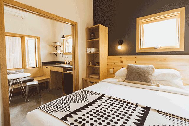 Adjacent to the schoolhouse is an inspired new build of 20 cabins—with ensuite bathrooms—encircling a bar, sauna, and spa with saltwater pools. Communal firepits spark in the night. Built into the mountain, the subterranean Sanctuary peeks out, promising yoga and wellness retreats.